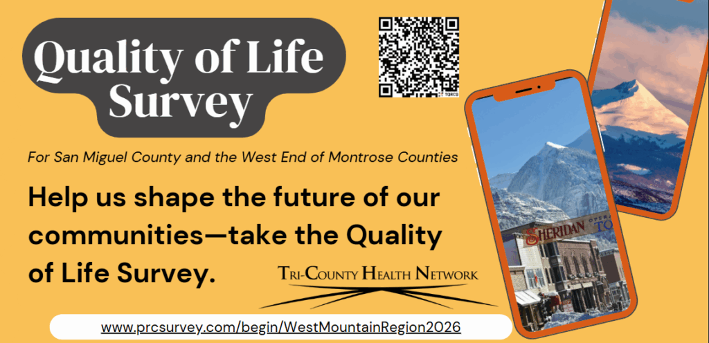 If you live or work in San Miguel or the West End of Montrose, click this link to take the Quality-of-Life Survey for 2025 – www.prcsurvey.com/begin/WestMountainRegion2026.