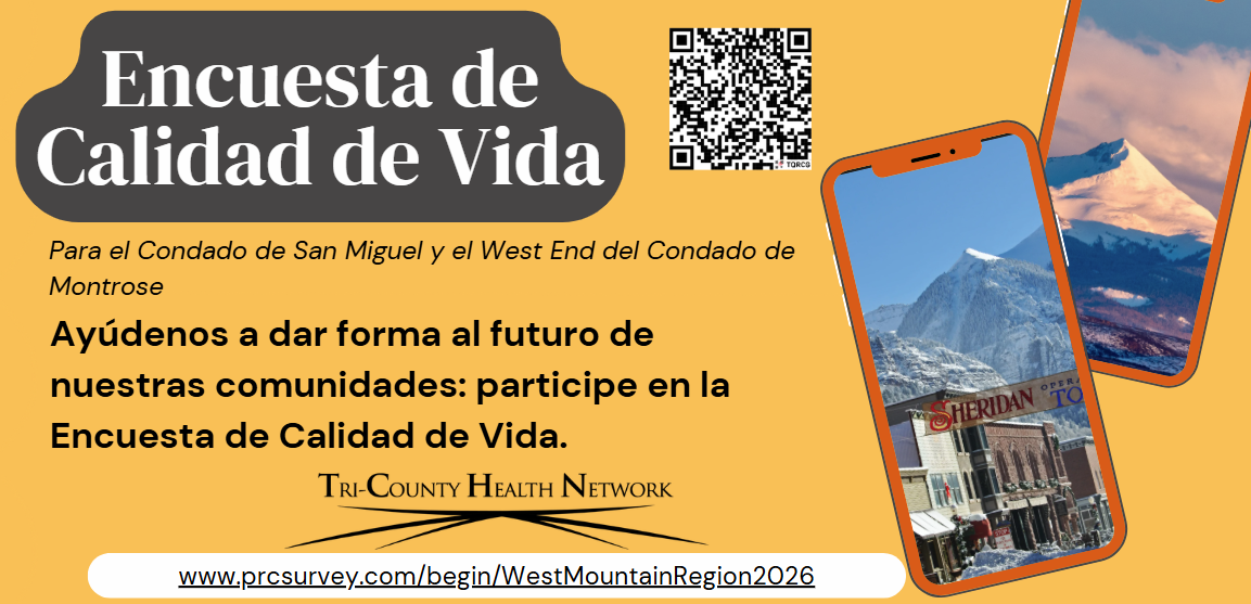 Si vive o trabaja en el Condado de San Miguel o en el West End del Condado de Montrose, haga clic en este enlace para participar en la Encuesta de Calidad de Vida 2025 – www.prcsurvey.com/begin/WestMountainRegion2026