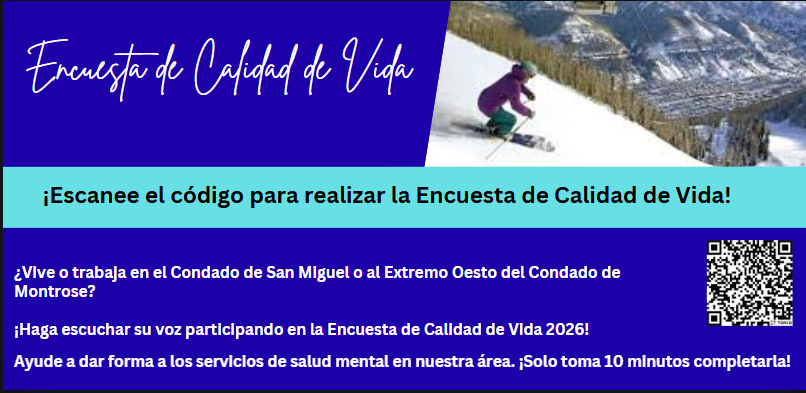 Si vive o trabaja en el Condado de San Miguel o en al Extremo Oeste del Condado de Montrose, haga clic en el botón a continuación para completar la Encuesta de Calidad de Vida para 2026: