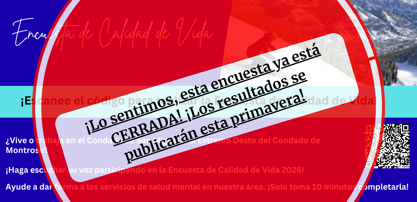 La Encuesta de Calidad de Vida ya está abierta, y se estarán recopilando respuestas hasta el 7 de febrero. Se anima a los residentes del Condado de San Miguel y al Extremo Oeste del Condado de Montrose (conocidos colectivamente como la Región de West Mountain) a participar en esta encuesta de 42 preguntas.